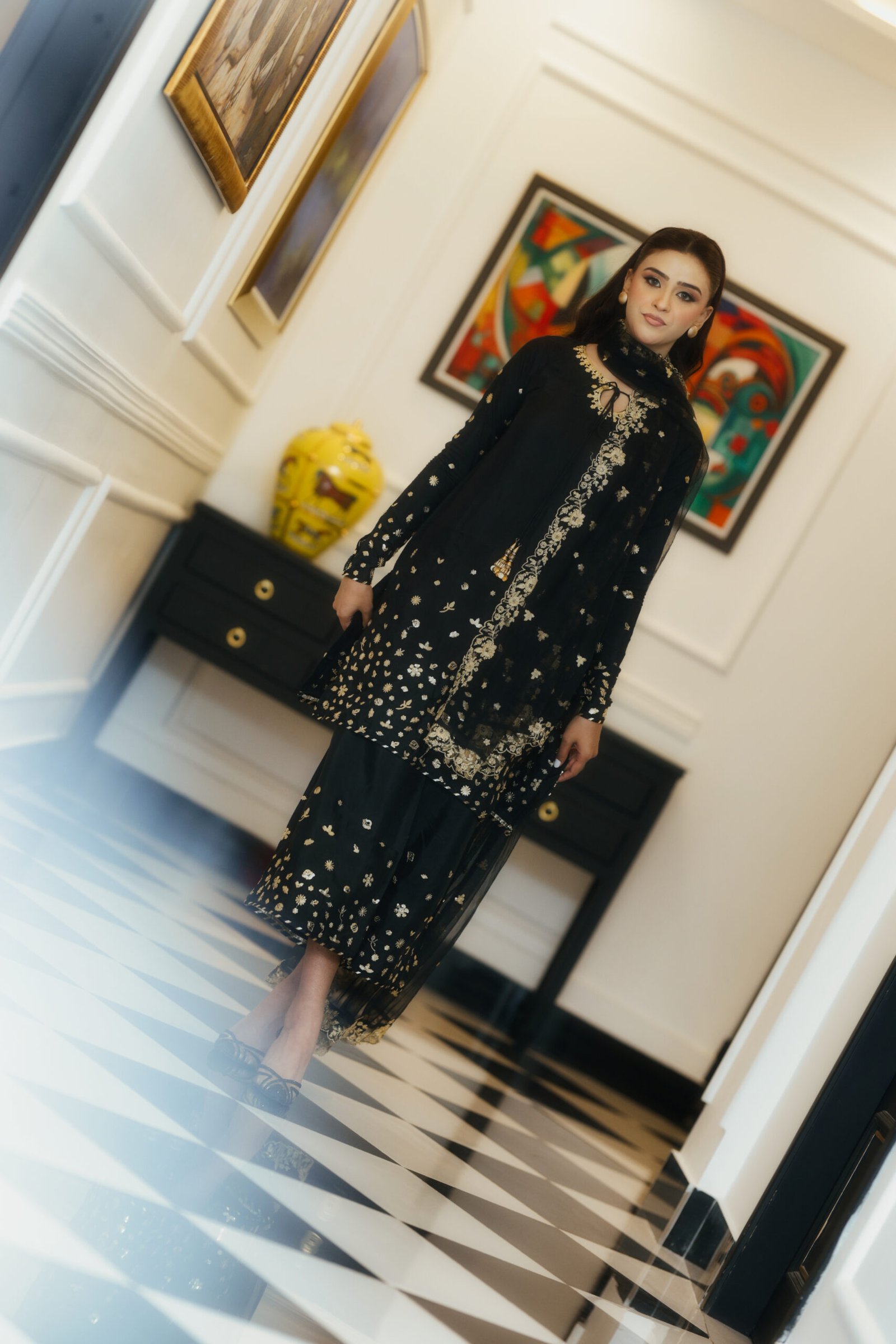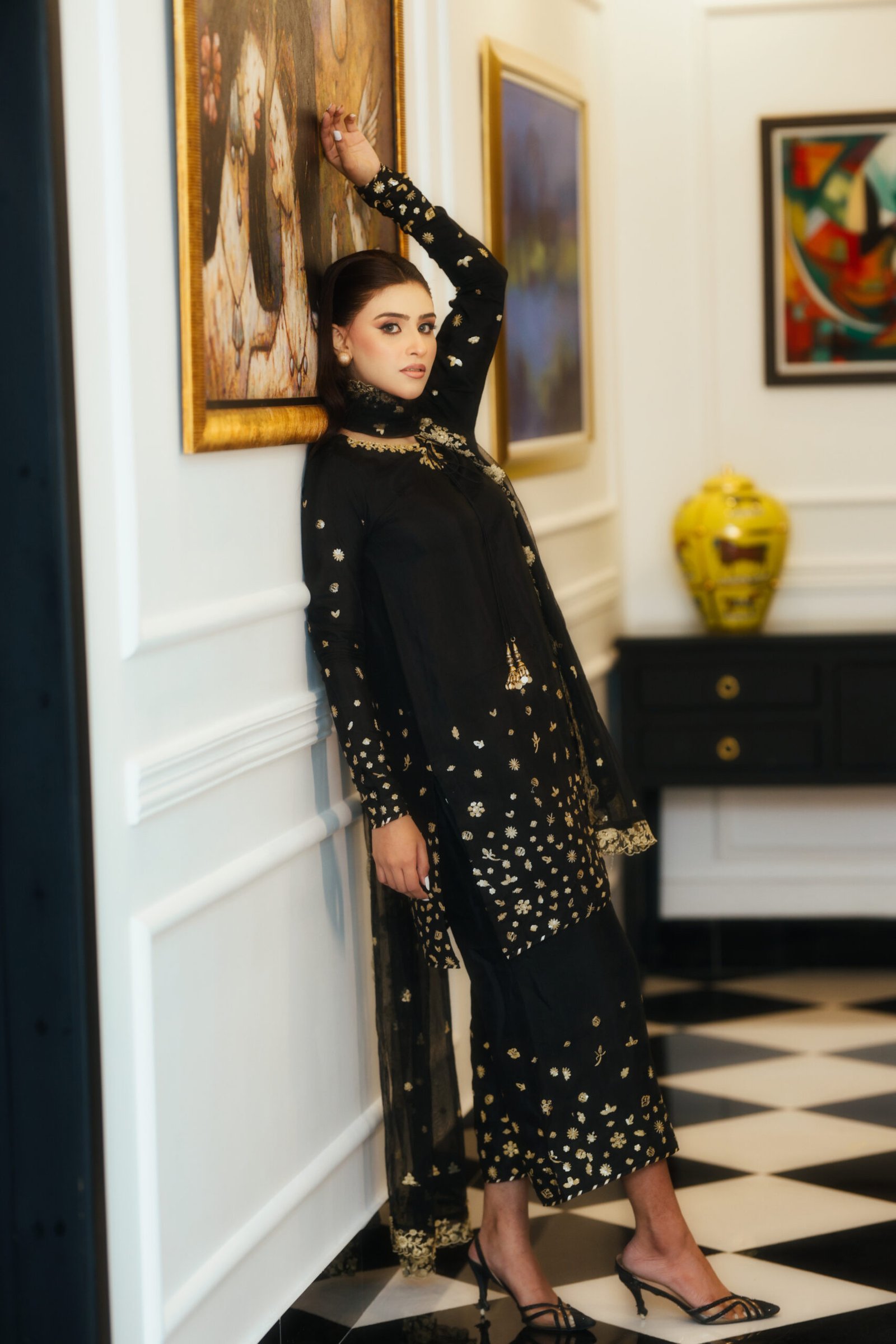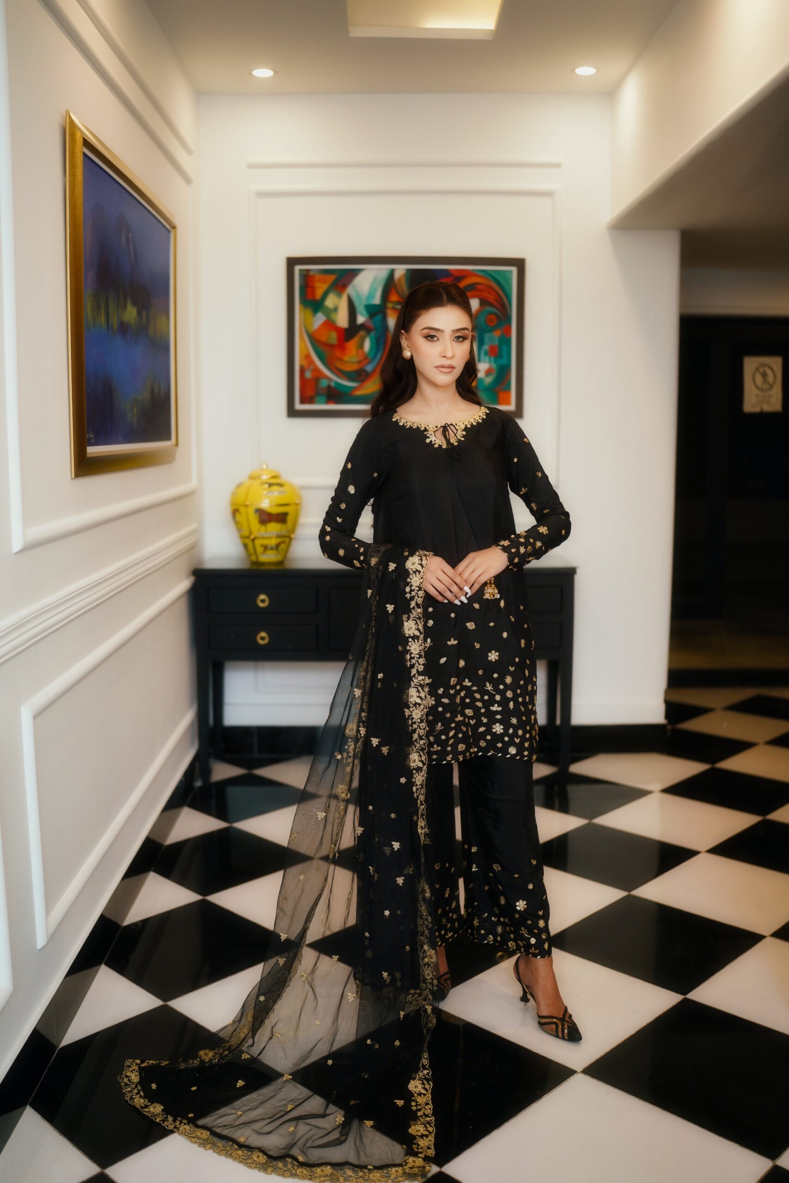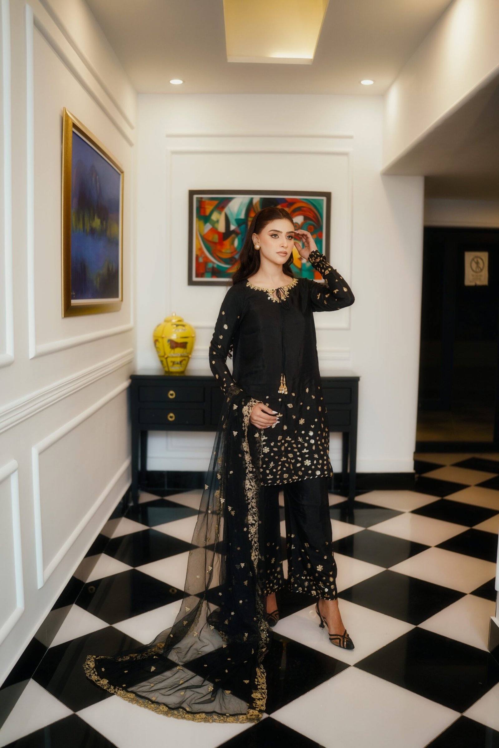 Step into timeless elegance with this exquisite black ensemble beautifully embellished with gold sitara work throughout the shirt, sleeves, and trousers.