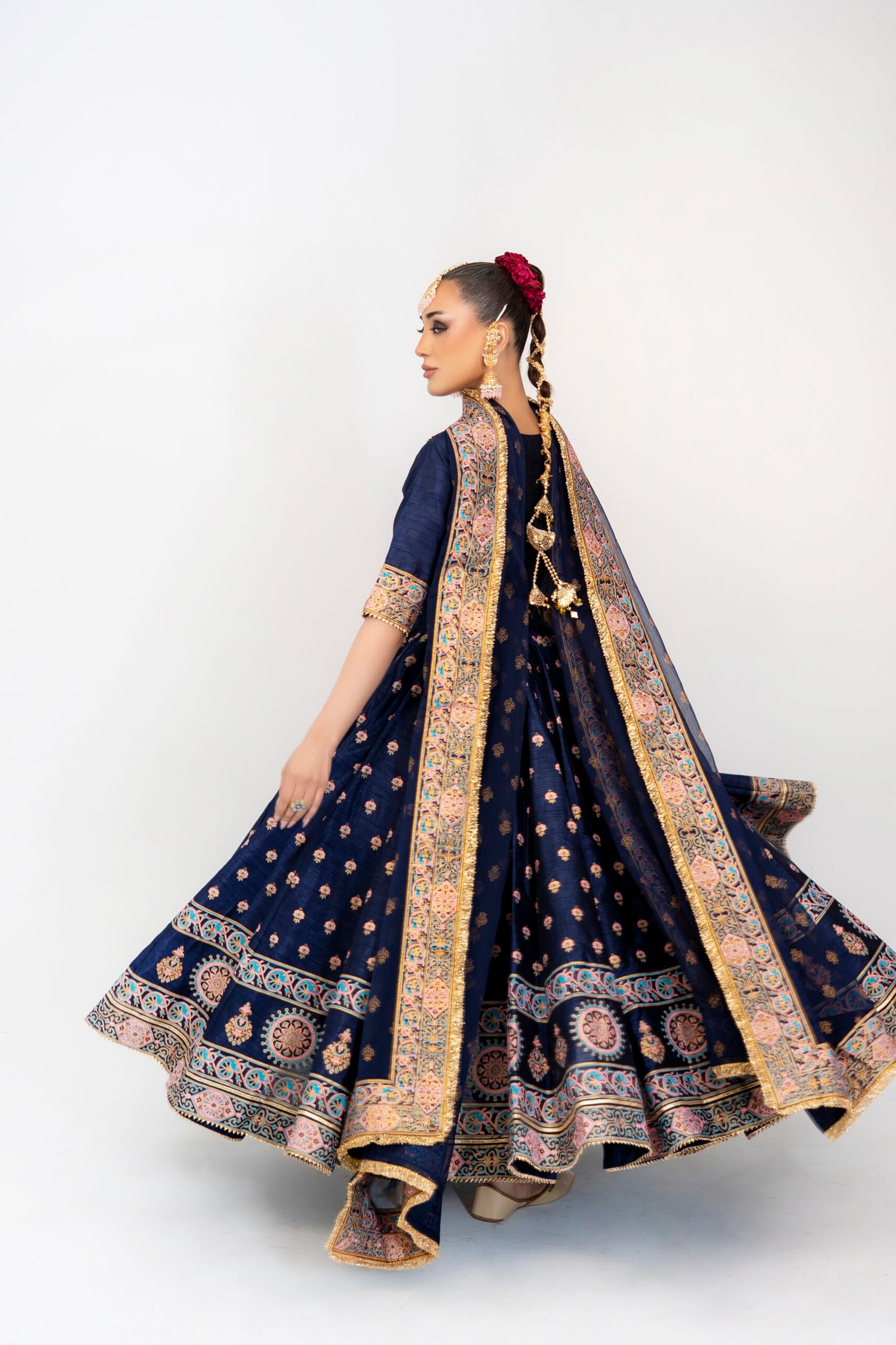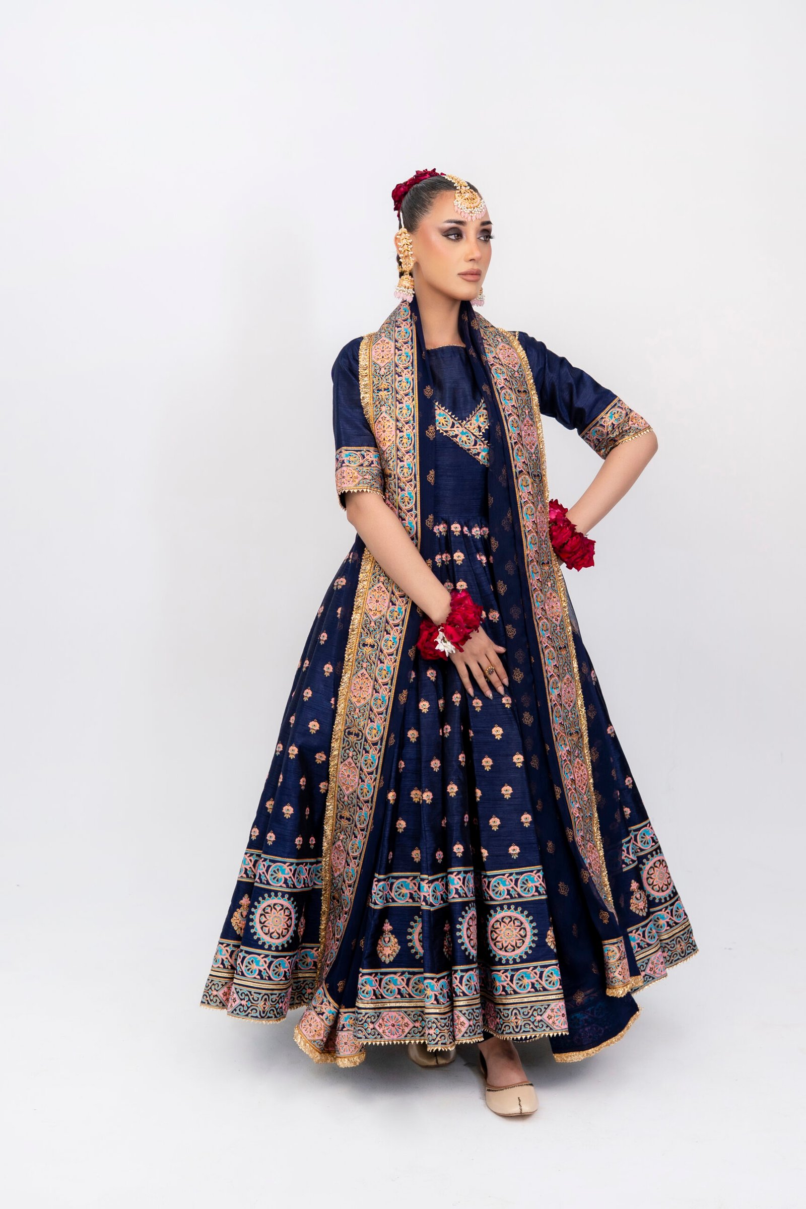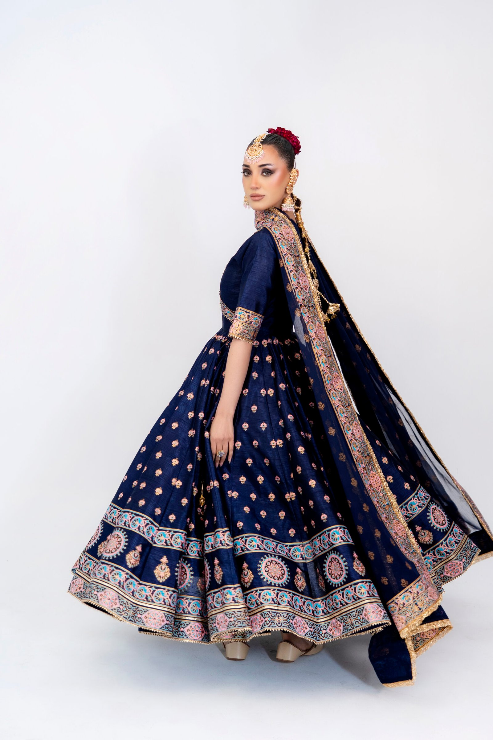 This Rawsilk Anarkali frock is crafted in a rich navy blue tone and designed with a stunning heavy flare for a luxurious, graceful fall. The panels are adorned with intricate block printing