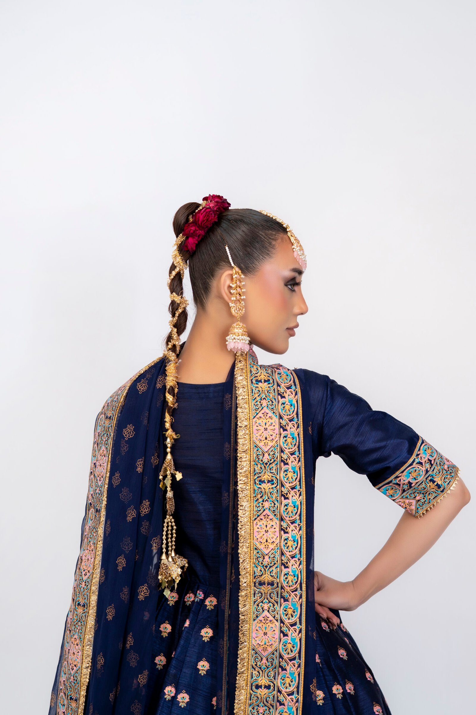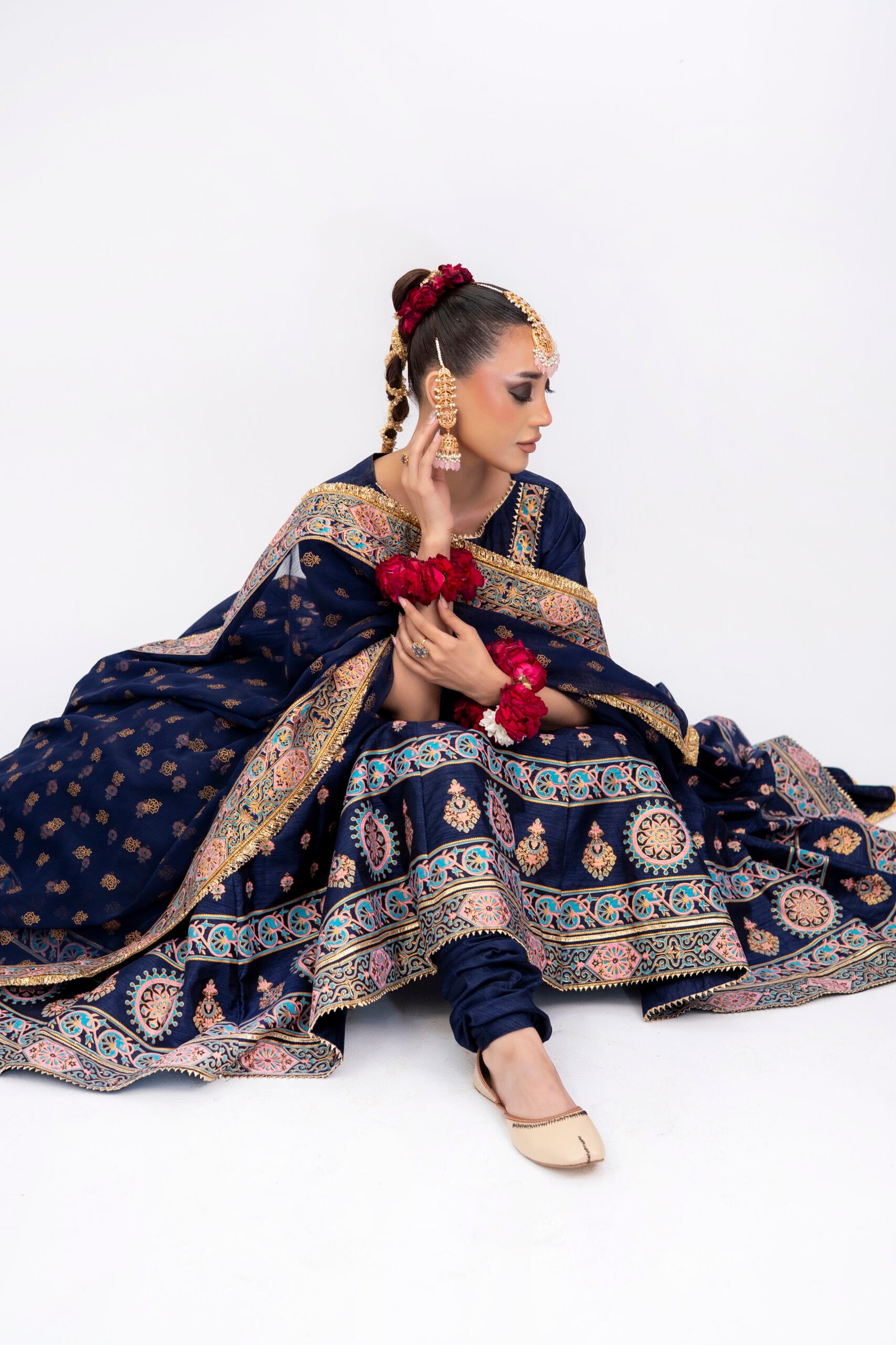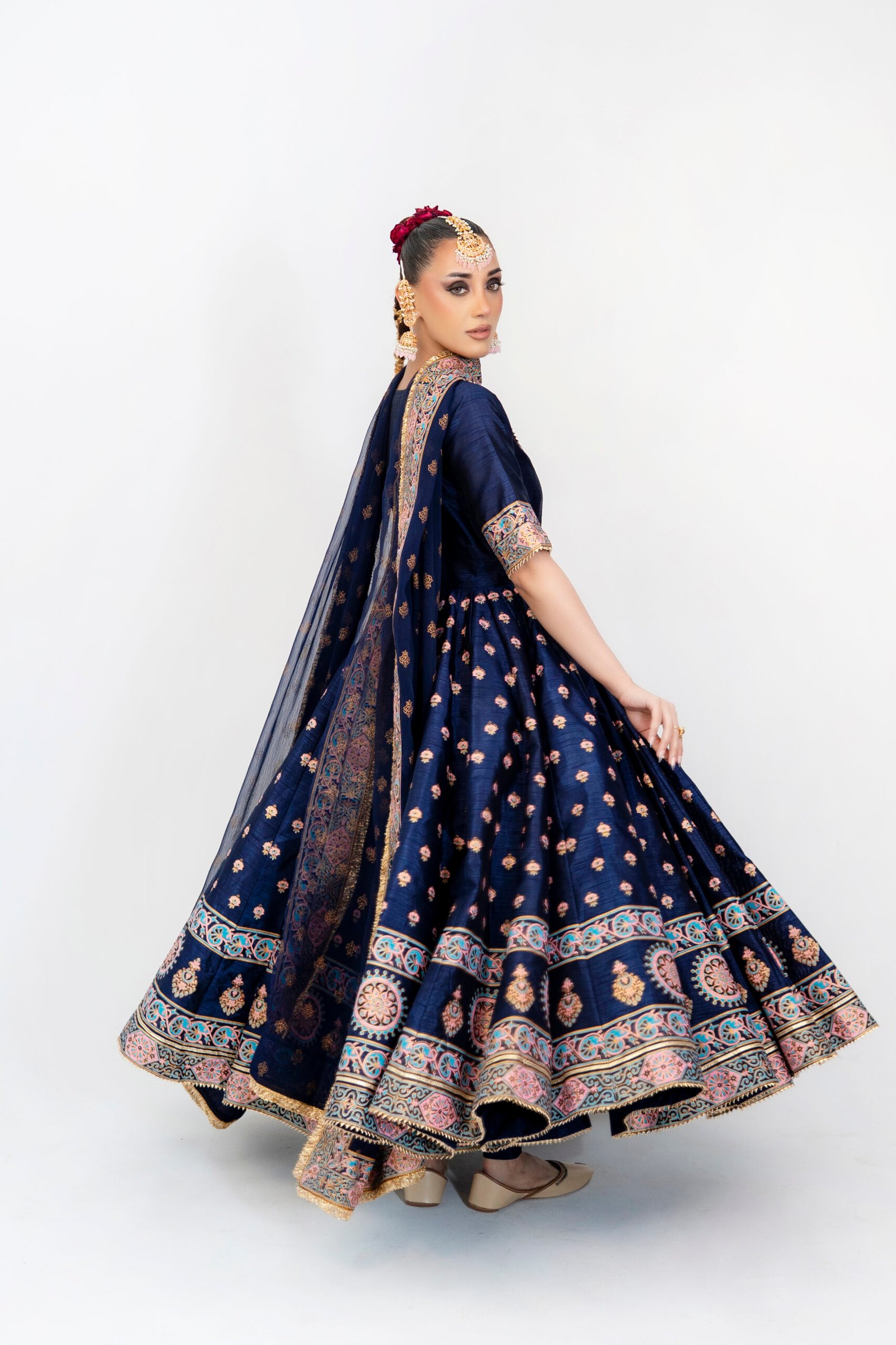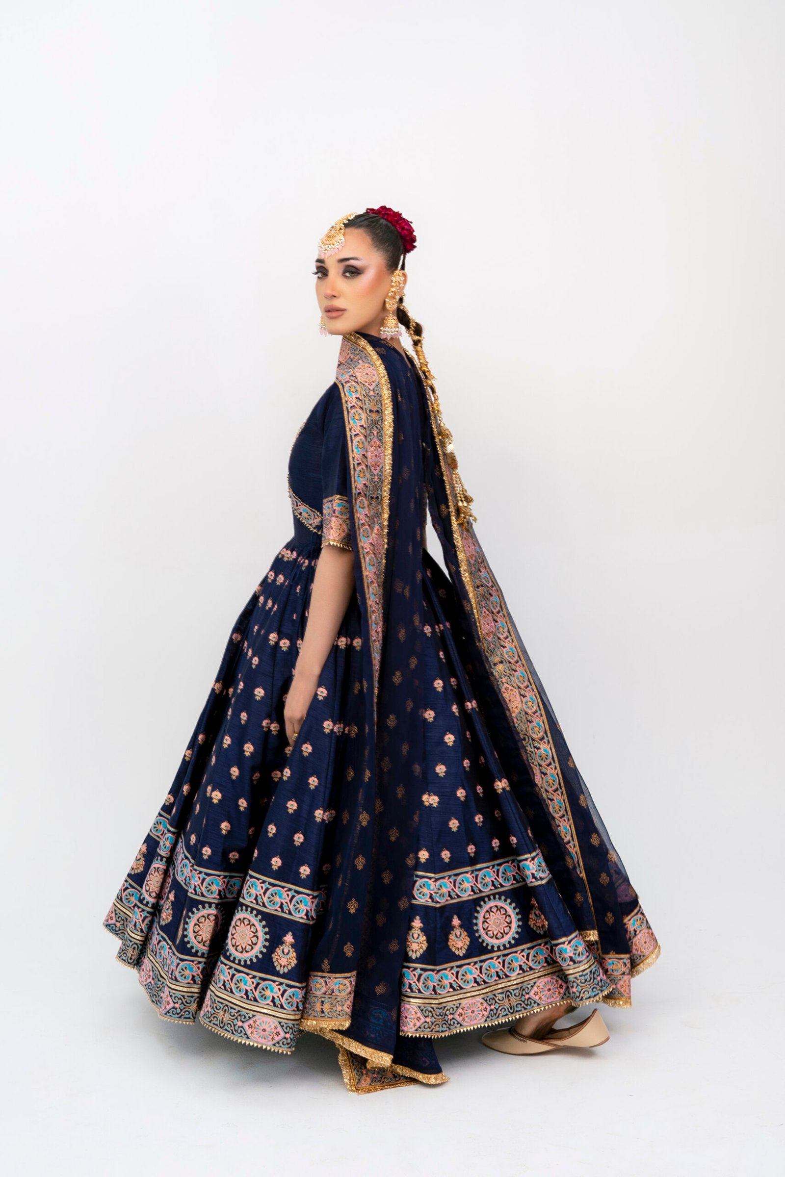 This Rawsilk Anarkali frock is crafted in a rich navy blue tone and designed with a stunning heavy flare for a luxurious, graceful fall. The panels are adorned with intricate block printing