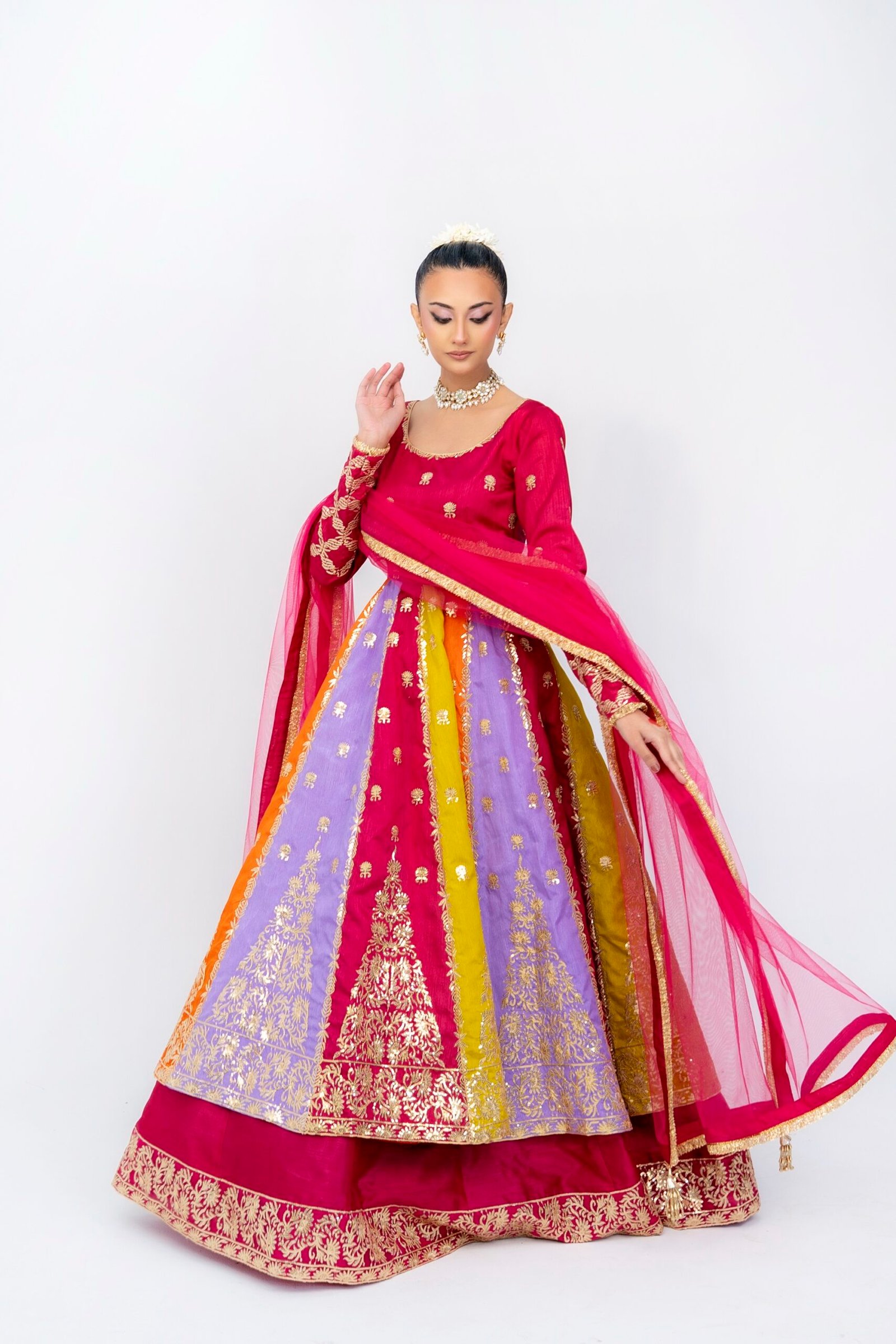 The outfit showcases vibrant multicolored panels with shades of pink, lilac, orange, and mustard each adorned with rich golden zari motifs that create a stunning festive look The bodice is deep pink with delicate gold buti embroidery and full sleeves decorated with detailed tilla work that adds elegance and continuity to the design